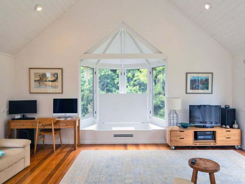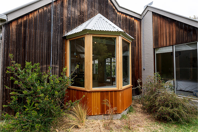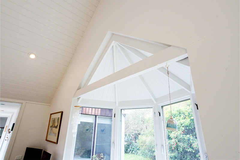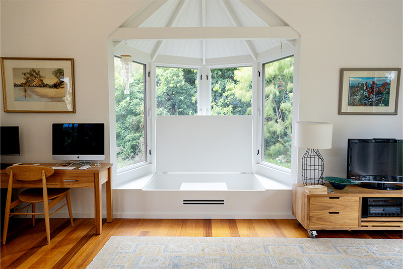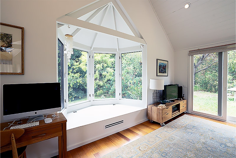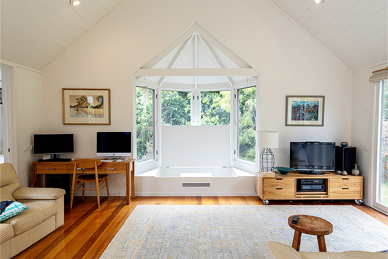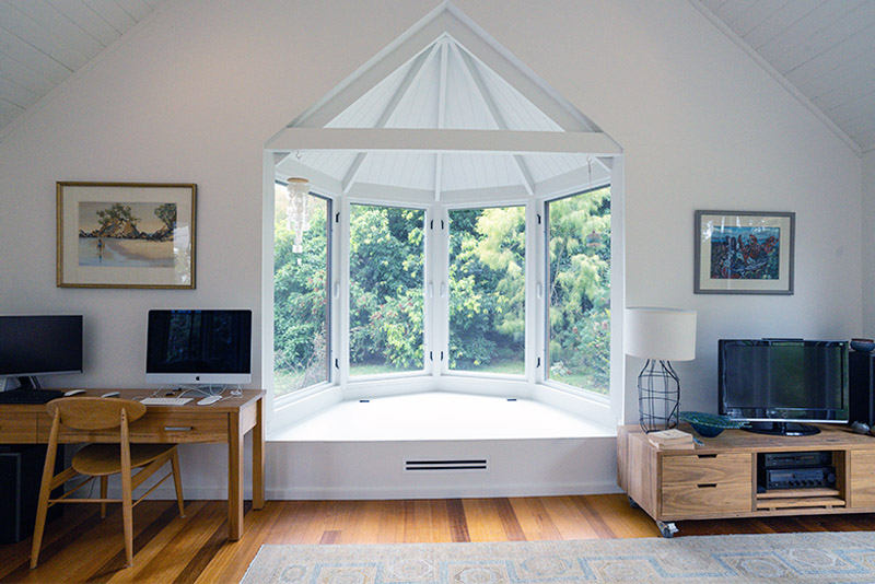 The new bay window features beautiful timber-framed windows, a cathedral ceiling lined with VJ boards, and exposed rafters—all finished with natural materials that required absolute precision from our team. Cedar cladding was used externally to ensure the new work tied in perfectly with the existing home, retaining its beachy, laid-back aesthetic.