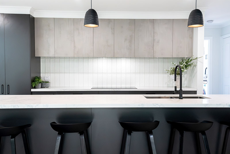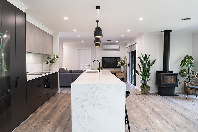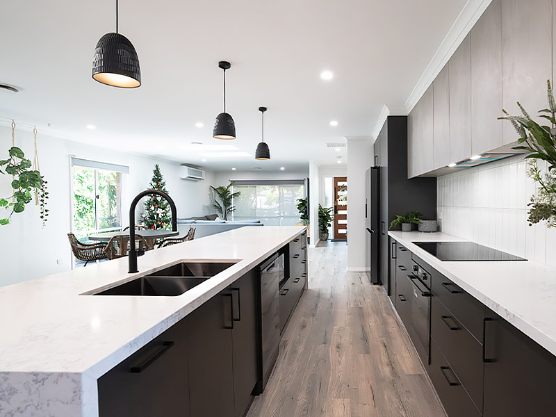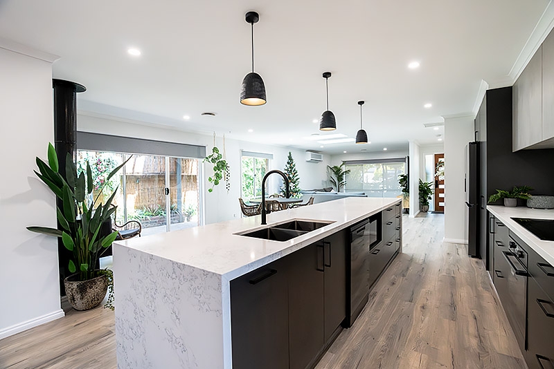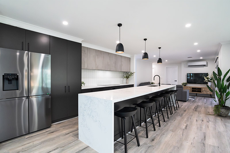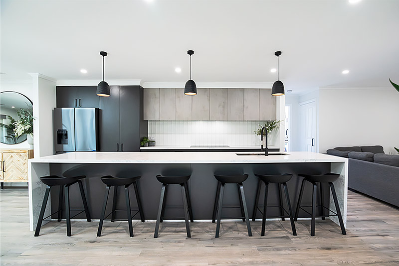 - Sleek Black Kitchen – A bold design statement featuring black cabinetry and an impressive 4m long island bench