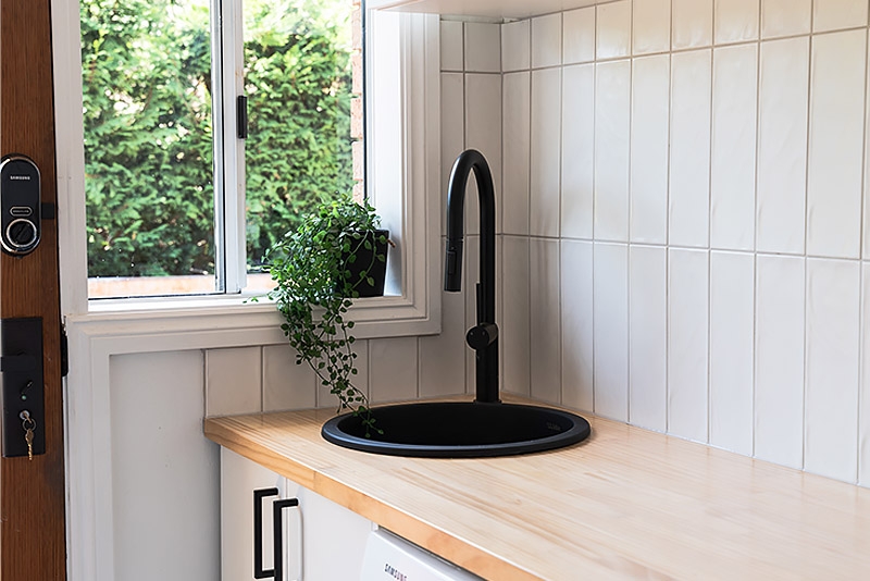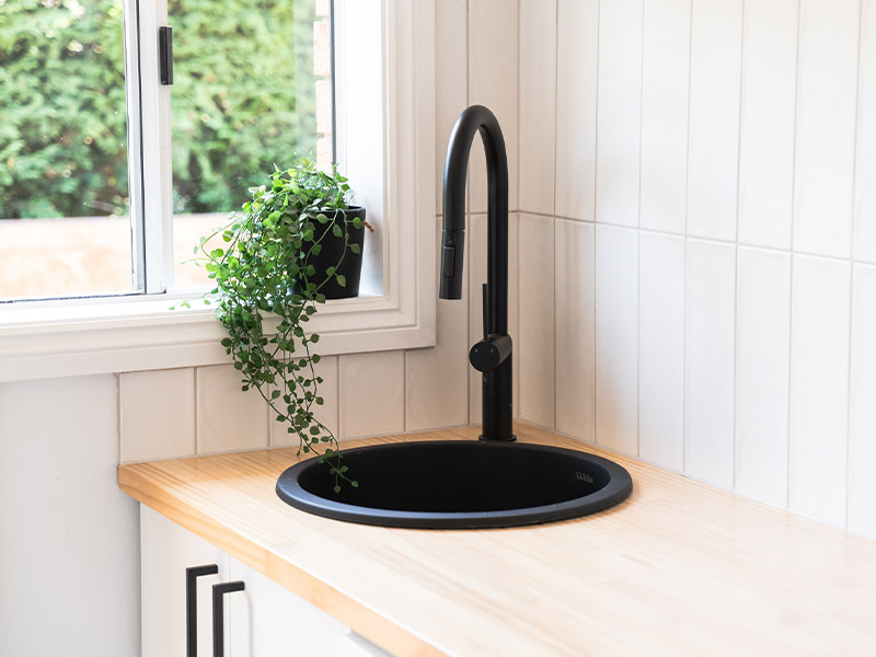 Key design upgrades played a big role in modernising the home. We introduced two new Velux skylights, bringing natural light into the heart of the home, and replaced the dated slate flooring with contemporary hybrid flooring throughout. The kitchen was completely reimagined into a bold, stylish space featuring a sleek black finish and complemented by premium black tapware from Reece—bringing a touch of luxury and edge to the everyday.