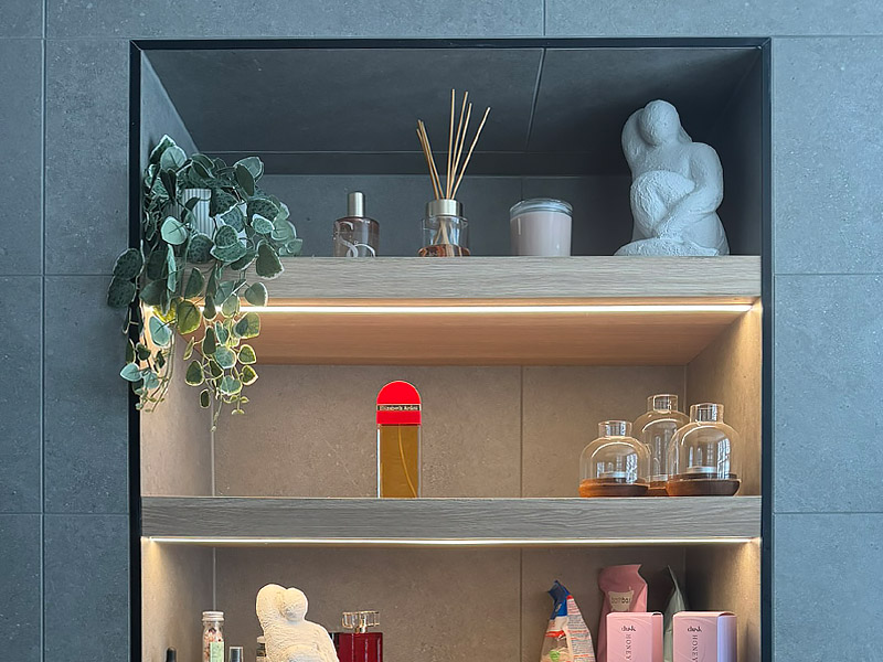 - Bathroom Feature Shelving – Custom-built shelving with soft under-glow lighting for a premium finish.