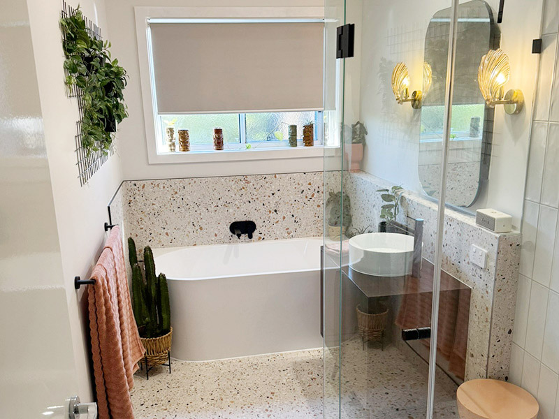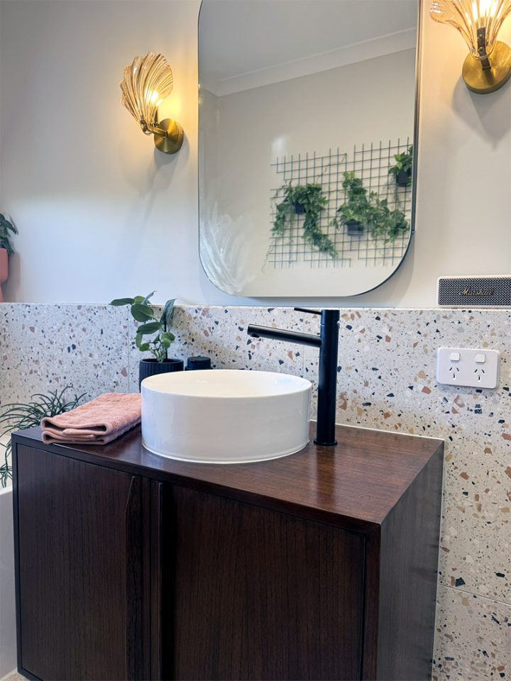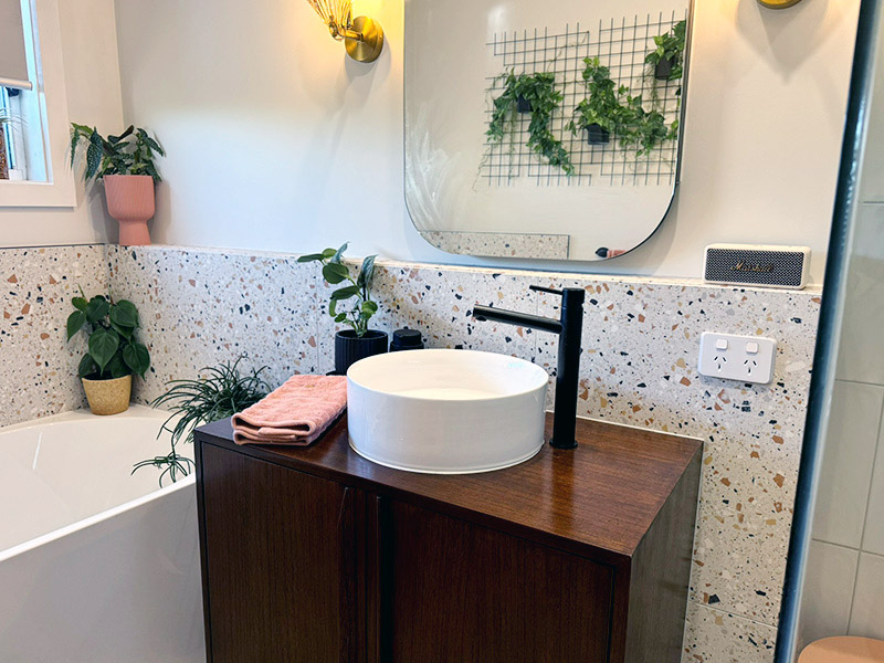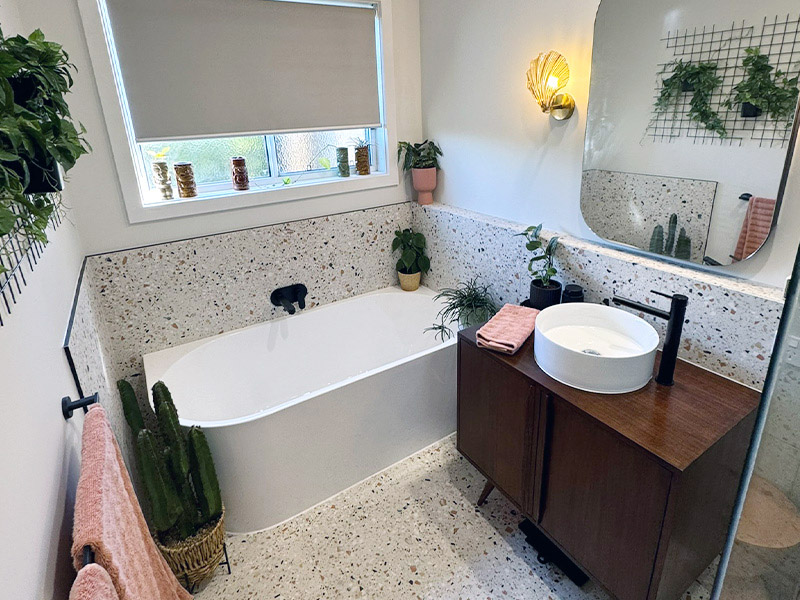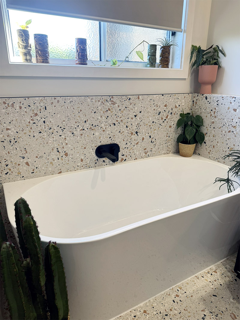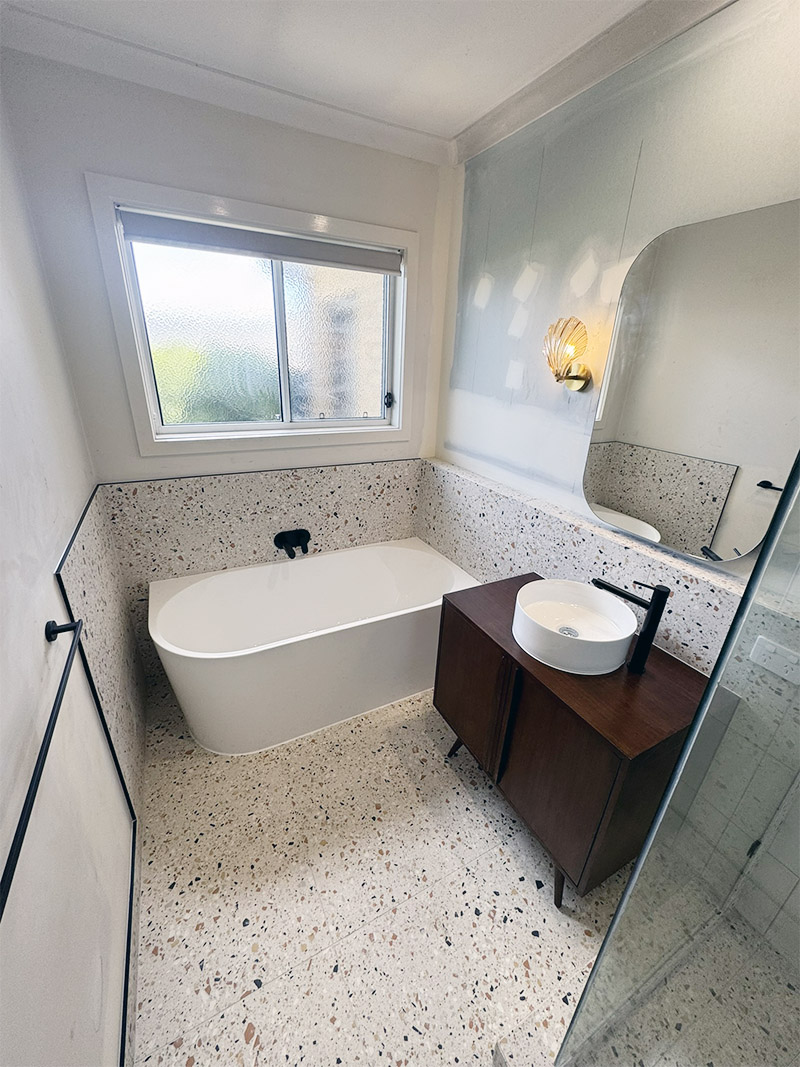 A freestanding corner bath added a touch of luxury, while black tapware throughout tied everything together with a crisp, modern edge. Paired with our client’s unique and playful styling choices, this bathroom now feels vibrant, balanced, and built to last.