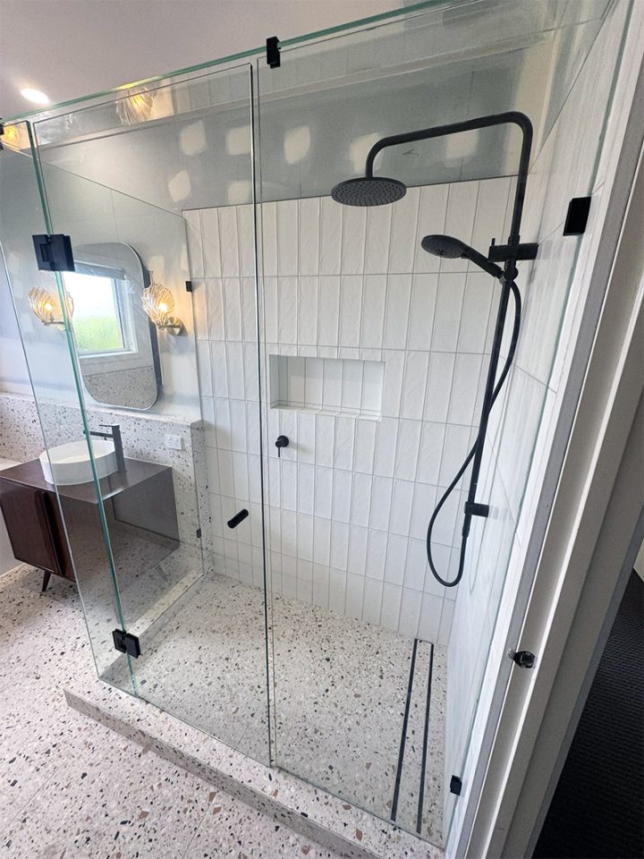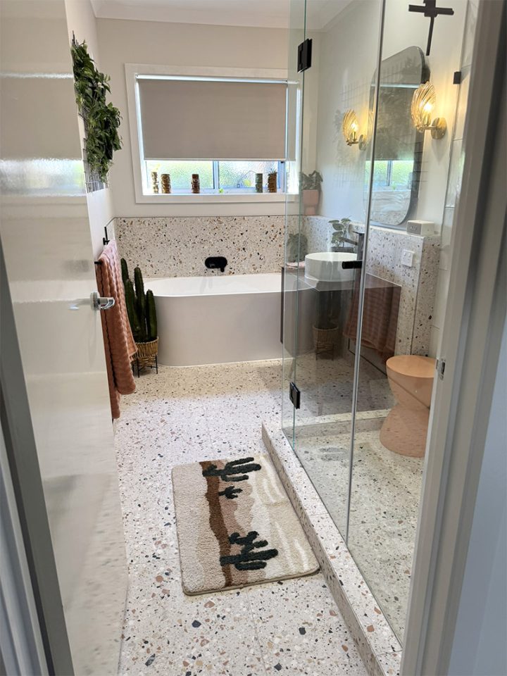 - Oversized Shower – 1500x900mm walk-in shower with frameless screen and bold terrazzo tile finish.