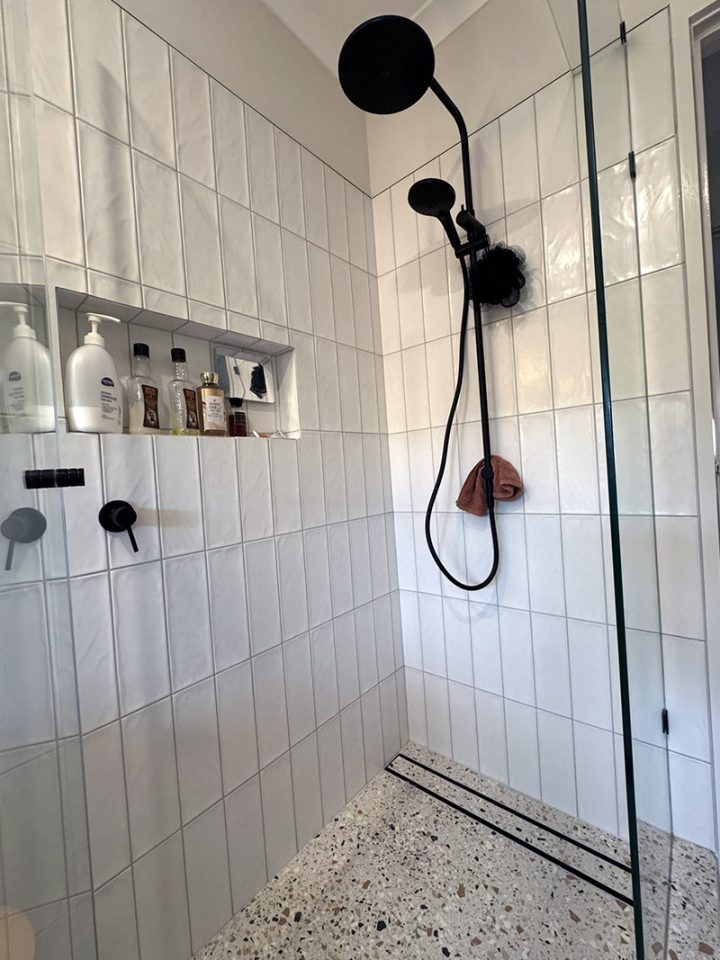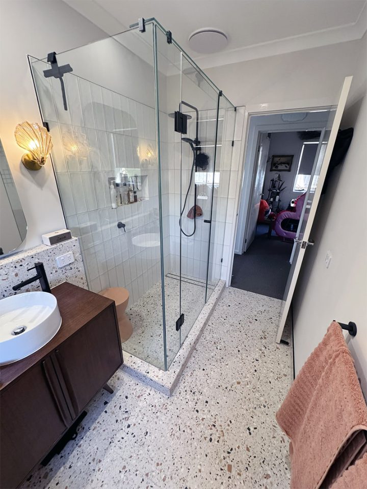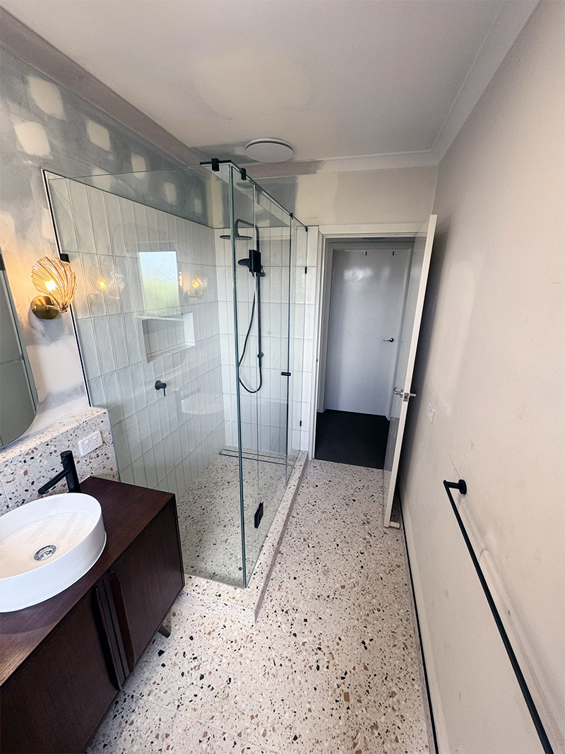 To create a more functional and spacious layout, we reconfigured the entire bathroom, relocating plumbing and even shifting the linen closet. This allowed us to make room for a striking 1500x900mm walk-in shower, fitted with a sleek frameless screen and finished in bold terrazzo tiles that set the tone for the space.